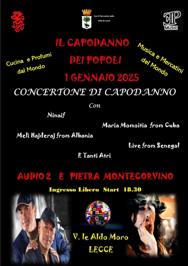 Mercoledì 1 gennaio, il Mercatino delle Arti e delle Etnie ospiterà il “Capodanno dei Popoli” per dare il benvenuto al 2025 all’insegna della multiculturalità. Il concertone avrà inizio alle 18.30 presso la grande location a cielo aperto di via Aldo Moro a Lecce. Sul palco dell’evento musicale organizzato dall’agenzia di spettacoli e produzioni EpMusic di Andrea Poci, si esibiranno gli Audio 2 e Petra Montecorvino, nell’ambito di una serata nella quale si mescoleranno tradizioni, musiche, profumi e mercatini dal mondo.