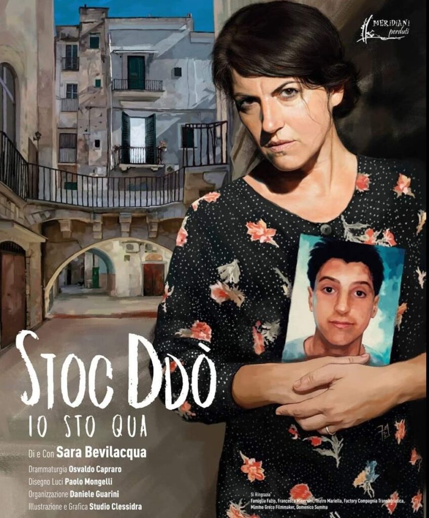 Sabato 8 marzo alle 19:30 (ingresso gratuito con prenotazione 3207087223) nell’Auditorium Zona Santi in via Torquato Tasso di Trepuzzi, in provincia di Lecce, per il progetto “(Di)Versi – L’albo illustrato come strumento di inclusione“, ideato da BlaBlaBLa con il sostegno del Comune di Trepuzzi | Assessorato alla Politiche sociali, in occasione della Giornata Internazionale della Donna, la compagnia Meridiani Perduti presenta “Stoc Ddo’ – Io sto qua“, interpretato e diretto da Sara Bevilacqua con drammaturgia di Osvaldo Capraro.