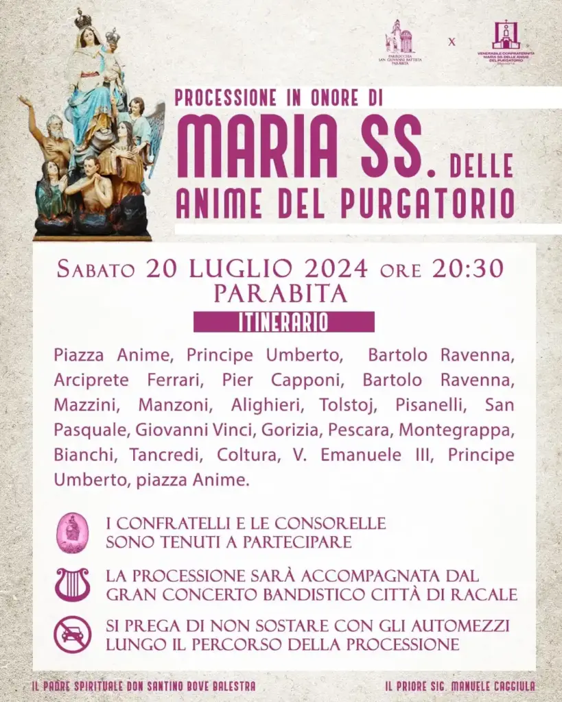 Proprio quest’ultima verrà celebrata a partire dal 20 luglio, giorno in cui si svolgerà la processione, che inizierà il suo cammino alle 20:30 dalla nota Piazza Anime e percorrerà tutte le principali vie di Parabita, accompagnata dal Gran Concerto Bandistico Città di Racale. La festività prosegue il giorno seguente quando, al termine della Santa Messa, avverrà il lancio dei palloni areostatici, che riempirà il cielo salentino in segno di pace e devozione.