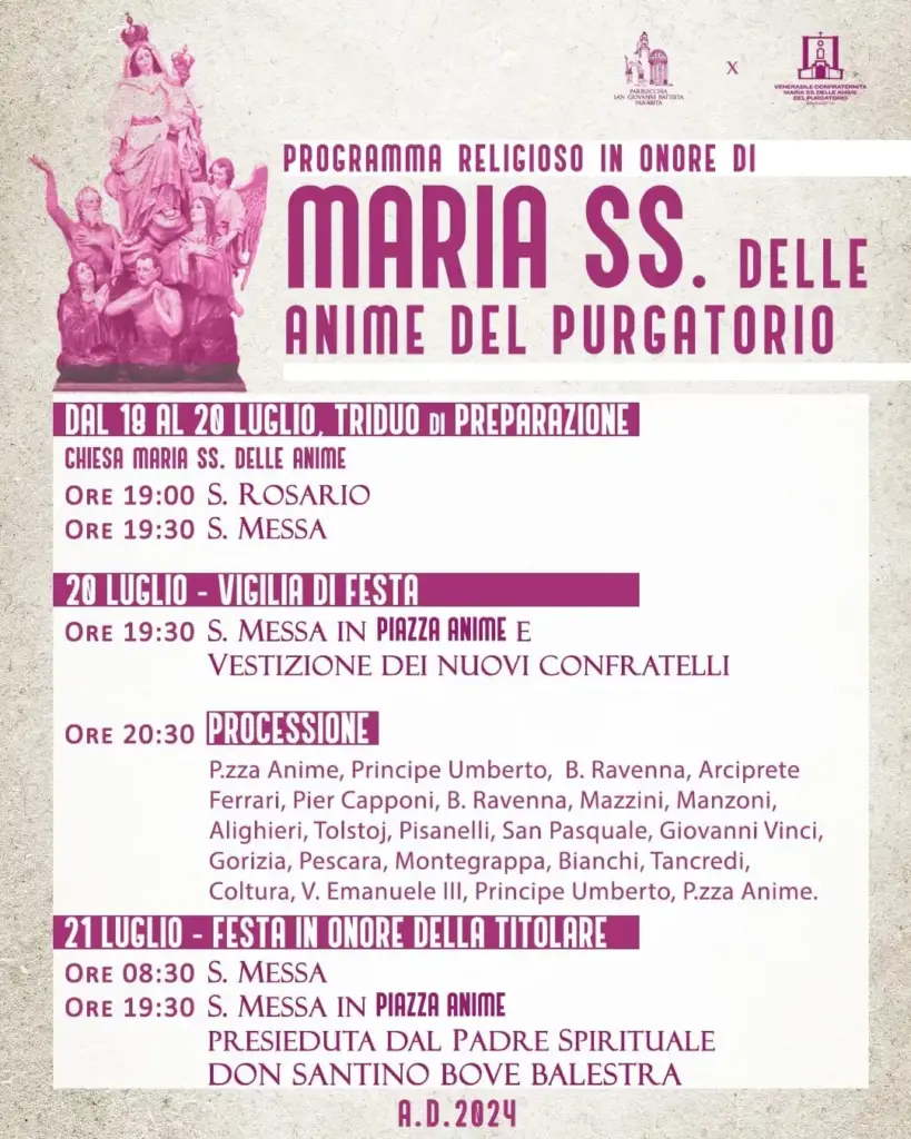 Ci siamo! Parabita è pronta e i festeggiamenti sono alle porte. Sono entrati nella fase finale i preparativi per la festa in onore di Maria Santissima delle Anime del Purgatorio, evento molto atteso dagli abitanti dell’antico paese salentino, che si riuniranno nelle proprie strade per godere delle calde serate d’estate in allegria, tra fede, musica e buon cibo.