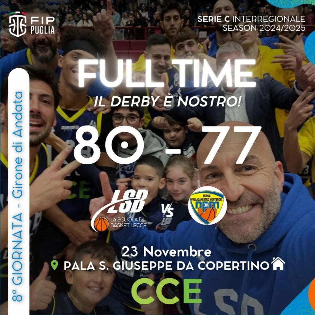 La Cce Lsb Lecce fa suo il derby a scapito di Monteroni e serve il poker di vittorie. I biancazzurri si sono imposti per 80-77 sul parquet amico del “San Giuseppe da Copertino”, in occasione della delle gara valevole per l’ottava giornata del campionato maschile interregionale di serie C Unica. I ragazzi di coach Michelutti hanno dimostrato freddezza e risolutezza nei momenti chiave di un match giocato punto a punto contro una squadra in salute e ben organizzata. Anche questa volta la forza del collettivo ha fatto la differenza. C’è chi con una palla rubata, un rimbalzo, un tiro libero o un recupero difensivo: tutti hanno dato il loro prezioso contributo nella vittoria che ha consentito alla Cce Lsb Lecce di volare a 12 punti in classifica. I 53 punti messi a referto complessivamente dal trio composto da Ingrosso, Cantagalli e Oundiae è stato il risultato di un grande lavoro di squadra, sia in fase difensiva che offensiva. I padroni di casa hanno vinto 3 dei 4 periodo mettendo a bersaglio 11 triple. I primi due quarti si sono giocati all’insegna di un sostanziale equilibrio, ma sono i locali a rientrare negli spogliatoi sul +4. Nel terzo periodo però i viaggianti si sono lasciati preferire con un Petrecci in giornata di grazia. All’alba del quarto periodo Monteroni è in vantaggio di un punto sul tabellone luminoso, ma nella fase topica del match i padroni di casa si sono riportati in vantaggio mettendoci grinta e cuore fino al suono dell’ultima sirena. “Bravi i ragazzi perché ognuno ha fatto bene chi con i canestri chi con i rimbalzi, difesa, chi con una palla recuperata, tiri liberi decisivi. Tutti hanno contribuito a questa vittoria mettendo il loro prezioso mattoncino – spiega a fine gara coach Michelutti -. Siamo soddisfatti di aver conquistato questo derby con le unghie e con i denti, pur sapendo che ci attende davanti un campionato lungo e molto equilibrato. Ad ogni modo nelle ultime gare abbiamo dimostrato cosa fare nei momenti chiave per portare a casa la vittoria. Ed è un aspetto molto importante in una competizione dove ogni gara si gioca punto a punto”.